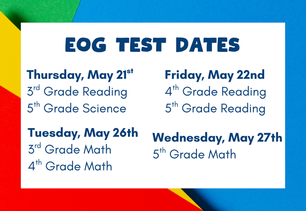 EOG Testing Dates 5/21 3rd Grade Reading 5th Grade Science 5/22 4th Grade Reading 5th Grade Reading 5/26 3rd Grade Math 4th Grade Math 5/27 5th Grade Math Published April 17, 2026 Print
